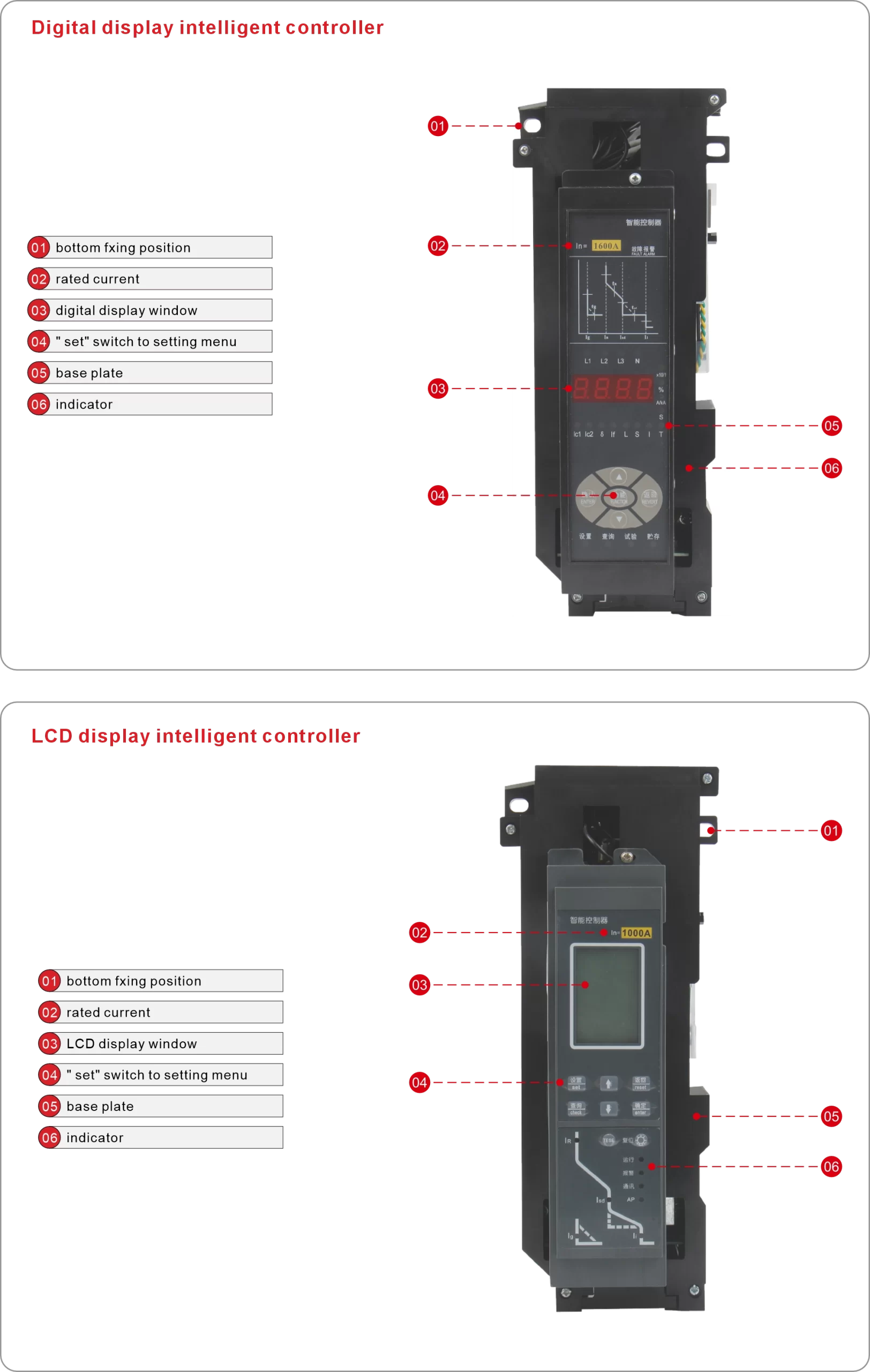 | 2M type: digital display 3M type: LCD display 2H type: communication function, digital display 3H type: communication function, LCD display | Shunt release Undervoltage release Closing electromagnet Motor-driven energy-storage mechanism Auxiliary contact | Mechanical interlock Automatic power transfer system Current transformer connected with neutral load |
